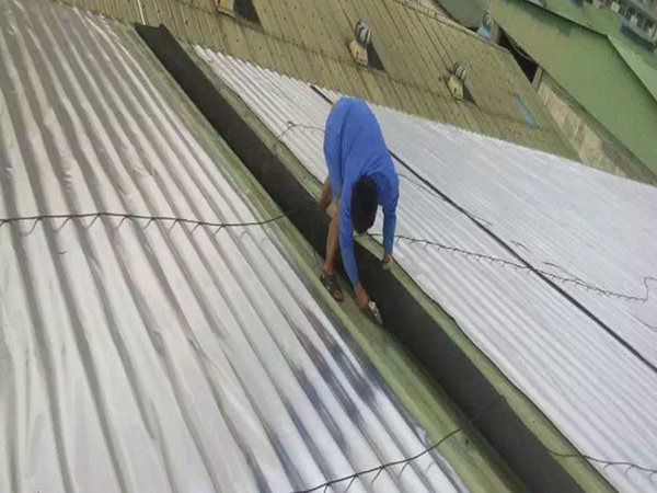 步骤4:把一边材料掀起来,从中间位置,沿着彩钢瓦凹面,每距离50cm,用热熔胶粘住,从凹曹的最顶端往下沾;这样依次往外粘胶;直至接缝位置,重叠在一起,整条接缝位置,用热熔胶整条密封,防进水